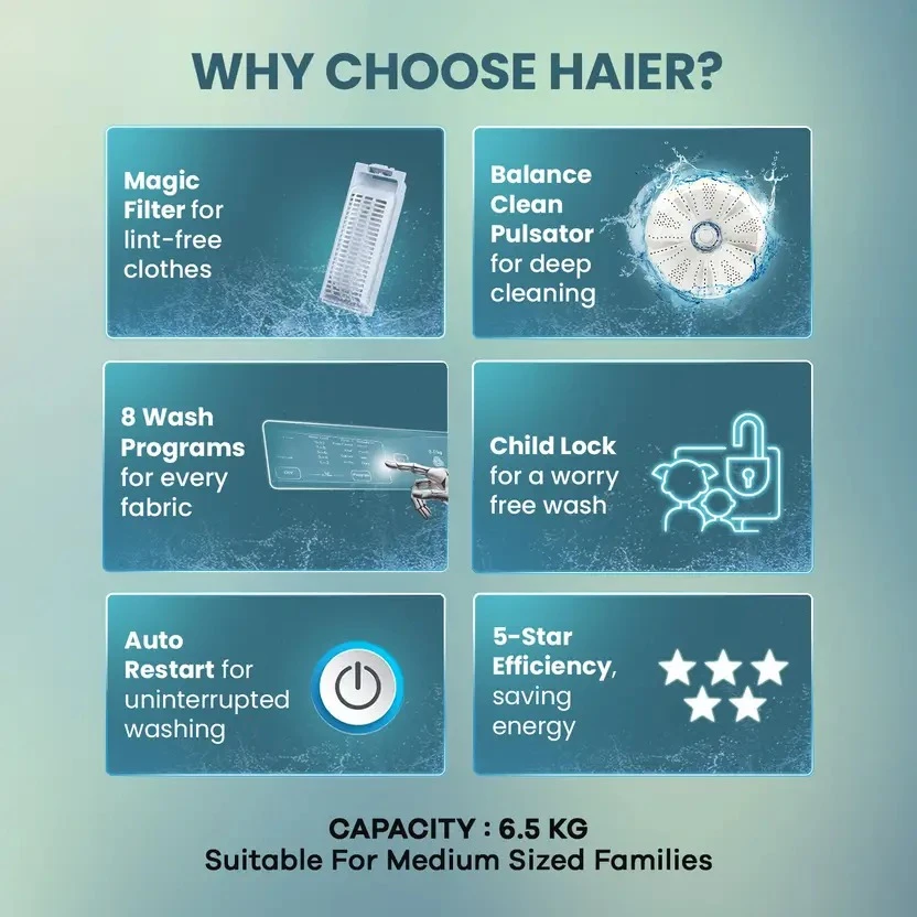 The Haier Fully Automatic Top Load Washing Machine offers 8 wash programs tailored for various fabrics and stains. It's Oceanus Wave Drum gently cleans clothes with reduced wear. The Dual Magic Filter captures lint, keeping both clothes and tub fresh. Auto Restart resumes cycles after power cuts, adding convenience. With Fuzzy Logic, the machine smartly adjusts settings based on load and dirt level for efficient and balanced washing every time.